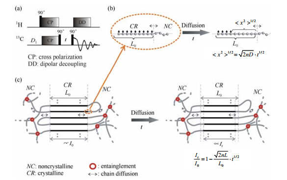 Recent works on the study of the chain diffusion in semi-crystalline PEs have shown that this motion could be easily studied by employing 1D 13C exchange NMR[56]. The pulse sequence used is the same as the “Torchia” pulse sequence[57] [see Fig. 9(a)]. Provided that chain diffusion is the only possible way to depolarize 13C in the crystalline regions of PE for short times t, the decay of crystalline signal monitors directly the chain diffusion. The relation between the change of 13C polarization and chain diffusion in the experiment is illustrated in Fig. 9(b) and 9(c). Eq. (1) describes the relationship between the normalized signal intensity and the diffusion time:
