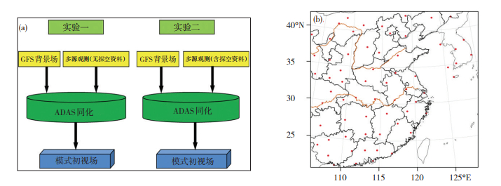 图 1 同化试验流程设计(a)及加密探空站点分布图(b) Fig. 1 (a)The flow chart of assimilation experiments, and (b)distribution of intensive radiosonde observations. |