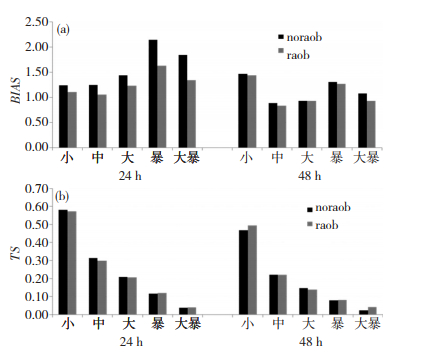 图 11 批量试验降水预报检验统计结果(raob表示同化加密探空资料,noraob表示无加密探空资料),(a)24 h累计降水预报偏差;(b)24 h累积降水预报TS评分 Fig. 11 Statistical results of rainfall forecast from one-month experiments (raob represents with intensive radiosonde observations; noraob represents without intensive radiosonde observations).(a)Bias for 24 h accumulated rainfall forecast, and (b)TS score for 24 h accumulated rainfall forecast. |