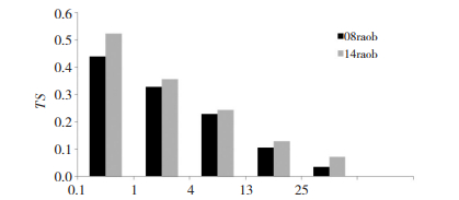 图 12 批量试验降水预报TS检验统计结果(08raob表示同化08时探空,14raob表示同化14时探空) Fig. 12 Statistical results of rainfall forecast from one-month experiments (08raob represents with intensive radiosonde observations at 00 UTC; 14raob represents with intensive radiosonde observations at 06UTC). |