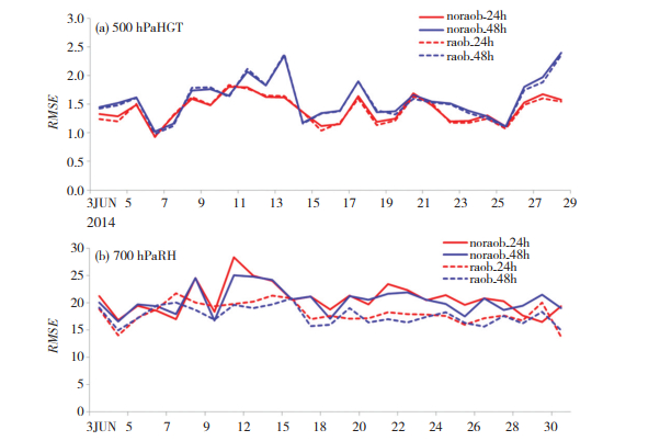图 13 批量试验有无加密探空资料500 hPa位势高度(a)和700 hPa相对湿度(b)检验统计结果 (raob表示同化加密探空资料,noraob表示无加密探空资料) Fig. 13 Statistical results of 500 hPa geopotential height and 700 hPa relative humidity forecasts from one-month experiments (raob represents with intensive radiosonde observations, noraob represents without intensive radiosonde observations). |