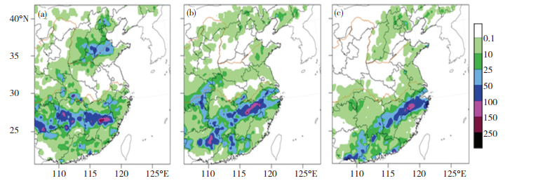 图 2 2014年6月19日08时—20日08时(a)、20日08时—21日08时(b)、21日08时—22日08时(c)24 h累计实况降水量(单位:mm) Fig. 2 Accumulated 24 h observed rainfall from (a) 08 BT 19 to 08 BT 20, (b)08 BT 20 to 08 BT 21, and (c) 08 BT 21 to 08 BT 22 June 2014 (unit: mm). |
