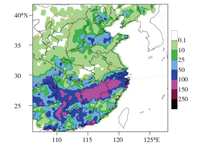 2014年6月19—22日,受梅雨锋和切变线影响,长江以南地区发生一次大范围降水过程,华东地区出现大范围暴雨天气。6月19—20日, 安徽南部、浙江西北部、江西中部出现暴雨, 江西中部和福建西北部局地有大暴雨(图 2a)。6月20—21日,暴雨区略有北抬东移,主要位于江西北部和皖、苏、浙交界,大暴雨主要出现在江西北部(图 2b)。6月21—22日,暴雨区进一步东移,主要位于江西西部和浙江境内,大暴雨主要出现在浙江西部(图 2c)。图 3显示了本次个例的过程实况累计降水量分布情况,长江以南地区出现大片的50 mm以上降水区域,其中从江西中西部至浙江西部有一条超过100 mm的强降水带。
