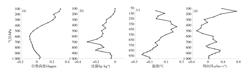 为分析加密探空资料对模式初始场的影响程度,采用增量分析方法(即敏感试验与控制试验的差值)分析各同化变量的变化情况,其中增量为模式范围内的平均结果。分析发现从6月19日14时—6月21日14时几个预报时次的扰动振幅分布特征类似。以6月20日14时起报个例为例,可见,位势高度的负增量主要位于500—900 hPa(图 4a), 500 hPa向上均为正增量,100 hPa达到最大正增量值。比湿增量除100 hPa外,其余层次均为负增量,负增量最大值位于700 hPa(图 4b)。温度增量从300—650 hPa为正增量(图 4c),其余层次均为负增量,正增量最大值在400 hPa, 负增量最大值为925 hPa。u增量的正增量和负增量从低层到高层交替出现,正增量最大值150 hPa, 负增量最大值为500 hPa(图 4d)。