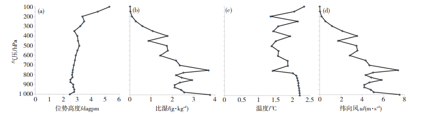 图 5 2014年6月20日14时模式分析场变量最大调整幅度随高度变化 (a)位势高度; (b)比湿;(c)温度;(d)纬向风u Fig. 5 Variation of maximum adjustments of model first guess field along with the height at 14:00 BT on 20 June 2014 for (a) geopotential height, (b) specific humidity, (c) temperature, and (d) the zonal wind. |