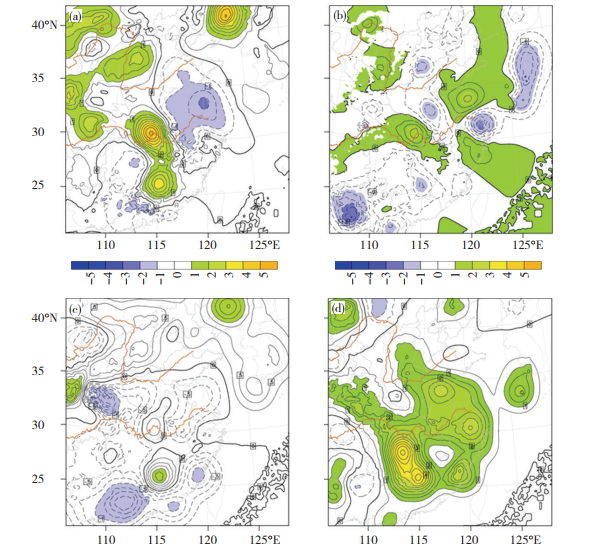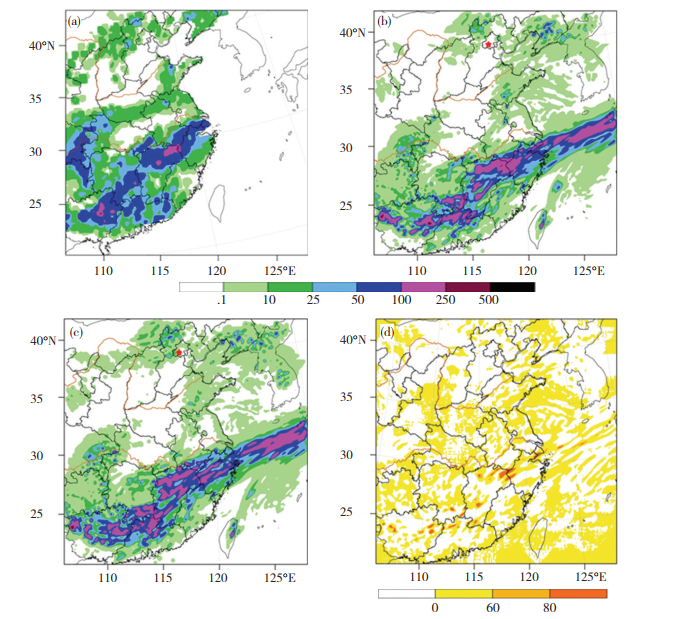 图 8 2014年6月20日14时—21日14时24 h累计降水(单位:mm) (a)降水实况,(b)敏感试验,(c)控制试验,(d)敏感试验-控制试验 Fig. 8 24 h accumulated rainfall(unit: mm) from 14:00 BT 20 to 14:00 BT 21 June 2014. (a)Observation, (b) sensitivity experiment, (c) control experiment, and (d) differences between sensitive experiment and control experiment. |