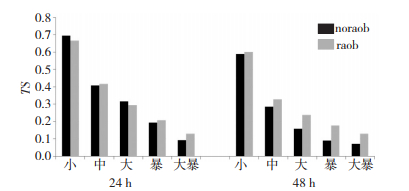 图 9 模式6月20日14时起报的有无加密探空资料24 h、48 h累计降水预报TS评分对比 (raob表示同化加密探空资料,noraob表示无加密探空资料) Fig. 9 Comparison of TS scores for 24 h and 48 h accumulated rainfall forecast between with raob and without raob experiments, model initiated at 14:00 BT June 20(raob represents with intensive radiosonde observations; noraob represents without intensive radiosonde observations). |