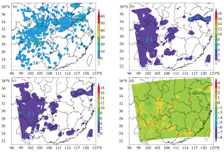 4.4.1 第一次循环同化预报结果分析鉴于本文初值生成方案采用的是一次冷启动、两次热启动的循环同化方法,首先对第一次循环同化预报结果进行分析,用以考察B对模式结果造成的最直接的影响,分析对D2区域进行。第一次循环同化采用冷启动,以2013年7月4日12时GFS资料的分析场作为三维变分同化的背景场,也即初猜场,同化观测资料后获得的最优分析场作为初值驱动模式积分6 h,获得7月4日12时—18时逐时预报结果。图 9给出了2013年7月4日13时1 h累积降水量实况(图 9a)、CV3- B试验(图 9b)、本地化B试验(图 9c)以及两试验模拟差值(图 9d)分布,从图 9中可以看出,D2区所涵盖的范围内大于10 mm的实况1 h降水主要分布在藏东、川东南—滇东北、滇南、鲁南—苏北—皖北以及冀东北等地,此次降水局地性强、降水强度大,最大小时雨强达到75.9 mm·h-1,位于四川境内(102.29° E, 29.18°N)。CV3- B试验除对冀东北的1 h降水没有反映之外,对其他区域的降水都有所反映,但强度明显偏弱(最强雨强仅为18 mm·h-1),雨带位置也与实况有所差别;本地化B试验模拟的1 h降水分布与CV3- B试验类似,但已表现出较明显差异,两者降水差值达-8~4 mm,其中较显著的变化表现在:CV3- B试验对鲁南—苏北—皖北降水的模拟其南界明显偏北,而本地化B试验则将降水带南界向南推进明显,与实况更加接近。