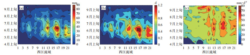 图 5 西江流域1971—2015年汛期旬平均暴雨面雨量(a,单位:mm)、日数(b, 单位:d)和强度(c, 单位: mm·d-1)分布 Fig. 5 The distribution of ten-day averaged (a) rainstorm areal rainfall(unit: mm), (b)torrential rain days(unit: d) and (c)the rainfall intensity(unit: mm·d-1) in flood season from 1971 to 2015 in Xijiang river basin. |