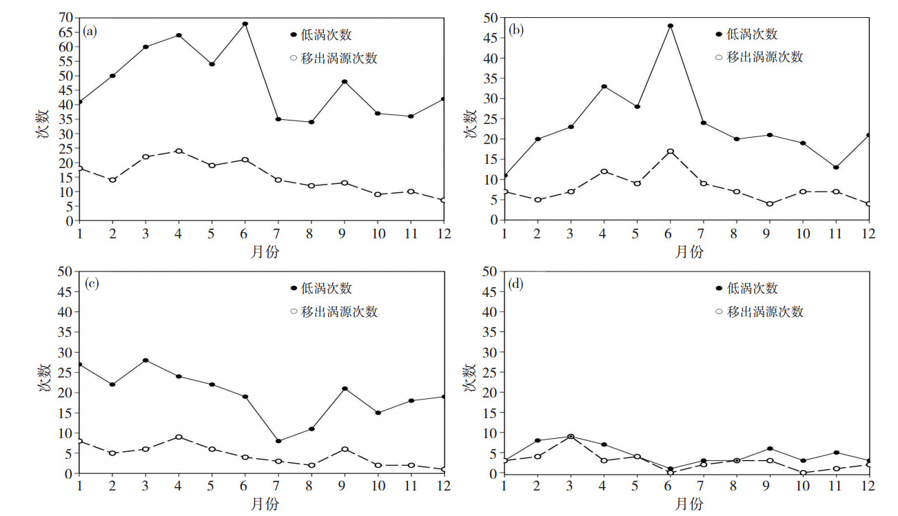 图 2 2012—2017年西南低涡(a)、九龙涡(b)、盆地涡(c)与小金涡(d)生成(实心圆)及其移出(空心圆)涡源的各月次数 Fig. 2 The generation (solid circle) and departure source region (opening circle) occurrence time in months of (a)Southwest vortex, (b) Jinlong vortex, (c) basin vortex, and (d) Xiaojing vortex. |