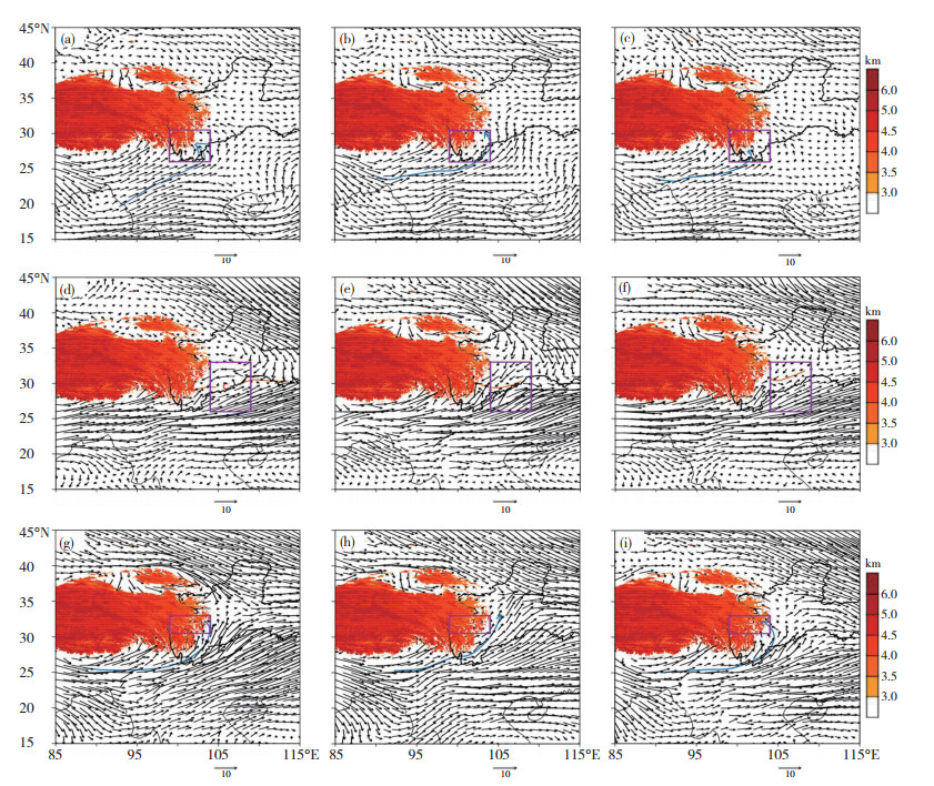 图 3 九龙涡、盆地涡、小金涡生成时(a、d、g)、生成前12 h (b、e、h)、生成前24 h (c、f、i) 700 hPa合成风场(单位: m·s-1) (彩色阴影区代表海拔高度≥3 km区域,框线示为涡源区域) Fig. 3 The composite wind field (unit: m·s-1) in (a, d, g) generation phase, (b, e, h) 12 h prior the generation phase, and (c, f, i) 24 h prior the generation phase on 700 hPa of the Jiulong vortex, basion vortex, and Xiaojin vortex, respectively (The color shadowed area is the area with altitude more than 3 km. Boxs indicate vortex source region). |
