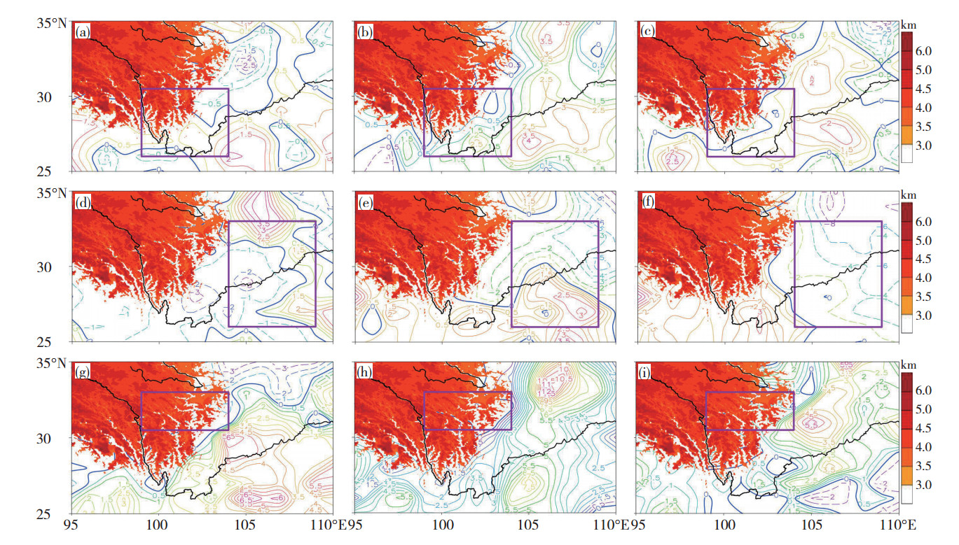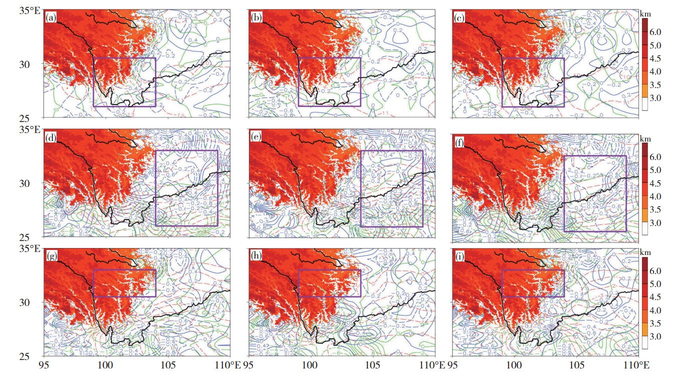 图 4 九龙涡、盆地涡、小金涡生成时(a、d、g)、生成前12 h(b、e、h)、生成前24 h(c、f、i)700 hPa合成南风分量24 h增量(等值线,单位: m·s-1, 框线和彩色阴影区说明同图 3) Fig. 4 The 24 h south wind increment field (contour lines, unit: m·s-1) in (a, d, g) generation phase, (b, e, h) 12 h before the generation phase, and (c, f, i) 24 h before the generation phase of the Jiulong vortex, basion vortex, and Xiaojin vortex, respectively (The box line and color shadowed area is same as Fig. 3). |