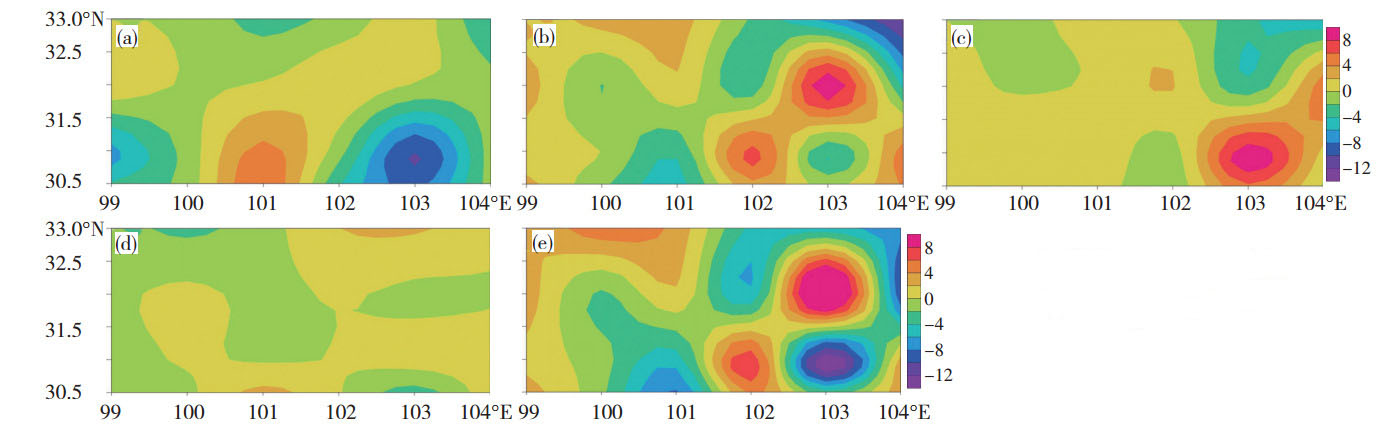 图 6 九龙涡涡区内700 hPa锋生函数值及各分量分布(单位: 10-10 m-·1K·s-1):生成前12 h F值(a);生成时F值(b);生成时F1值(c);生成时F2值(d);生成时F3值(e) Fig. 6 The distribution fields of frontogenesis function and its components on 700 hPa of Jiulong vortex zone (unit: 10-10 m-·1K·s-1) (a) 12 h prior the generation of F, (b) on generation time of F, (c) on generation time of F1, (d) on generation time of F2, and (e) on generation time of F3. |