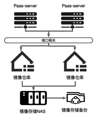 为保障系统的正常运行,并实现系统的故障检测与定位,设计了镜像仓库。镜像仓库的高可用实现方案如图 4所示。镜像仓库使用NAS(即网络附属存储) 作为共享存储,多个镜像仓库指向同一个NAS目录,通过负载均衡实现高可用。仓库中的镜像文件每天定时自动全量备份,接口网关做加权轮询负载均衡。