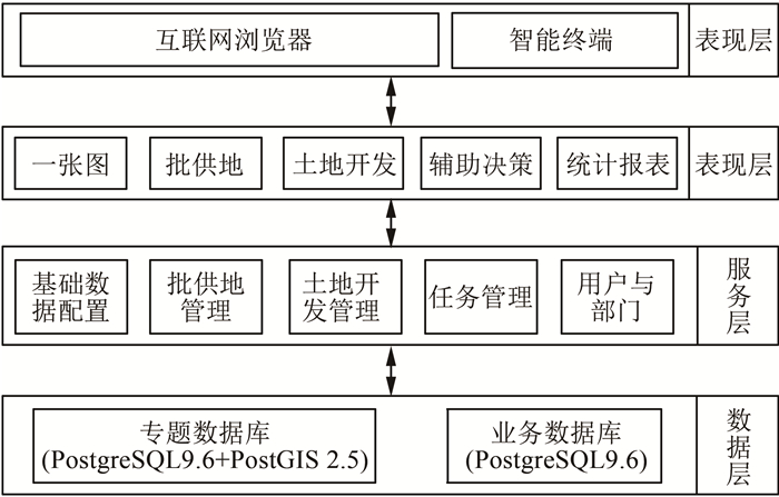 1 系统总体架构和功能设计 1.1 总体架构系统总体框架采用3层架构,基于B/S(browser/server)模式进行搭建(见图 1)。3层架构为表现层、服务层和数据层。表现层为系统的界面,以特定的规则展示数据,服务层为应用功能实现的相关开发工具和组件,数据层为系统运行应用所依赖的各类数据。