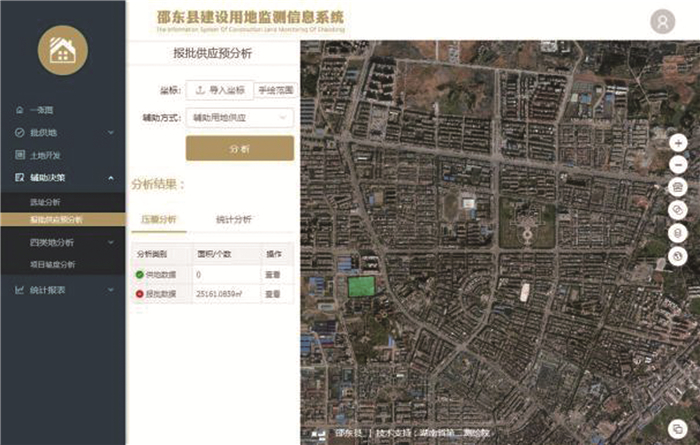 4) 辅助决策:提供选址分析功能,选择特定行政区,根据土地利用规划和选址面积筛选符合条件的所有区域;提供辅助用地报批与供地功能,通过导入坐标或选择手绘范围,依照报批或供地规则,结合批供地相关数据对选定区域进行压覆分析,判断报批与供地是否合理;提供四类地分析功能,分析或展示批而未供、供而未用、未批先供、未供先用四类地;提供坡度分析功能,根据输入的范围及坡度阈值分析出给定范围内坡度大于阈值的区域。