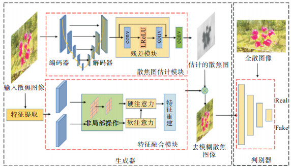 1 非局部生成对抗散焦去模糊模型 1.1 算法网络结构本文使用生成对抗网络,整个DNGAN模型的架构见图 1,其中生成器的设计包括了3个部分:特征提取模块、散焦图估计模块和特征融合模块。判别器采用VGGNet[8]的基本结构,通过训练缩小生成器的生成结果和真实全焦图像之间的差距。