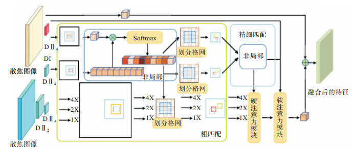 特征融合模块引入了软硬注意力机制,通过由粗到细的非局部相似度计算,最大限度的挖掘相似纹理信息,并结合散焦图估计模块的预测结果,联合指导散焦区域的去模糊重建,模块结构图如图 2所示。模块将输入的散焦图像特征图通过大卷积核Softmax计算得到高相似性特征对应的位置,再在该区域内划分格网进行同样方法的细分相似查找,获得最大相关值和其对应的位置,分别传入软、硬注意力模块。在硬注意力模块中,输入的最相似位置与散焦图像特征进行通道级联,传入卷积层得到融合特征。在软注意力模块中,将融合的特征与最大相关性向量进行点乘,并与不同尺度的散焦图像特征进行交叉融合,使相关性强的纹理信息获得相对更大的权重,相关性弱的纹理信息能够因小权重而得到抑制。最后将计算得到的初步融合后的特征值与散焦估计模块生成的散焦图进行点积,得到兼顾散焦信息的特征融合结果。