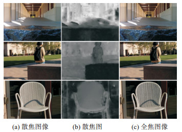 2.1 数据集及实验环境数据集:本文数据集采用DED数据集[5],它是一个小型公开数据集,包含1 012个图像对,分为散焦图像、散焦图和全焦图像3个部分,见图 3。DED数据集中数据来自多视图数据集[11]和由LytroIllum光场相机[12]捕获的图像。本文实验选择其中的48组作为验证集,剩下的964组为训练集,并对图片进行随机翻转、颜色变化等数据增强[13]操作以丰富训练数据内容,提升结果的鲁棒性。另外实验引入了公开数据集SYNDOF [4]来验证DNGAN模型的泛化能力和鲁棒性。
