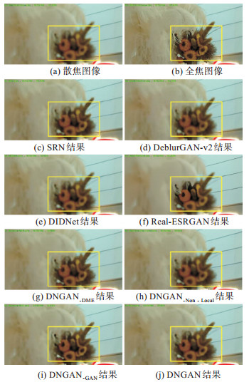 2.3.1 图像去模糊相关模型的效果对比实验对于散焦图像的图像去模糊,实验输出了验证集数据在SRN [14]、DeblurGAN-v2 [15]、DIDNet [5]模型下的视觉效果图,以及进行了降采样Real-ESRGAN [16]模型的结果图,对比图见图 4和图 5。实验计算了各个模型的峰值信噪比和结构相似性的值,见表 1,可以看出均低于本文DNGAN模型结果。对比SRN去模糊模型,输出图像(见图 4(c)、图 5(c))中依旧存在较严重的模糊现象。对于DeblurGAN-v2去模糊模型,图 4(d)较图 4(j)选中区域缺少毛流纹理,图 5(d)较图 5(j)选中区域掉漆处的边缘并不清晰。由图 4(f)和图 5(f)可以看出,经过下采样的Real-ESRGAN [16]模型结果过于平滑,缺少高频纹理信息。对比DIDNet模型(见图 4(e)、图 5(e)),本文模型结果的细节更为丰富且真实。