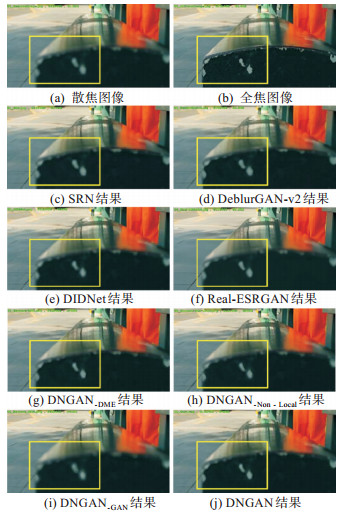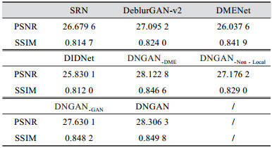 2.3 实验结果分析对比实验分为4大部分,分别是图像去模糊相关模型的效果对比实验、去模糊模型的泛化性实验、散焦图估计相关模型的效果对比实验和DNGAN模型模块的消融实验。