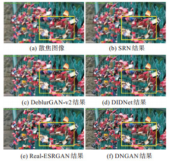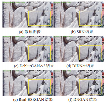 为了验证本文模型在其他数据集上的泛化能力,本文选择SYNDOF [4]数据集进行了测试,结果见图 6、图 7。对比黄色框选中区域可以看出本论文提出的DNGAN模型在复杂场景去模糊任务中,保证了图像的色彩一致性且纹理边缘更为清晰,细节更为丰富;在重复纹理场景下,如图 7(f)所示,DNGAN模型重建出了更多石面凹凸不平的细节纹理,模型结果更为真实。