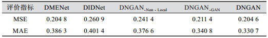 本文的消融实验训练了移除散焦图估计模块的模型DNGAN-DME、移除Non-Local模块的模型DNGAN-Non - Local和移除生成对抗网络模块的模型DNGAN-GAN。在去模糊实验中,散焦图估计模块可以充分学习散焦特征,移除该模块后,图像特征边缘会出现一定程度的扩散现象(见图 4(g)、图 5(g)),评价指标(见表 1)降低;移除非局部模块后(结果见图 4(h)、图 5(h)、表 1),纹理整体模糊,因为非局部模块可以有偏重地汇总相似纹理指导模型去模糊重建;GAN模块可以生成更为丰富的细节纹理特征,移除该模块后,图 4(i)、图 5(i)中黄色区域纹理趋于平滑,表 1中的客观评价指标值均低于本文提出的DNGAN模型。在散焦图估计对比实验中,由图 8(d)、8(e)可以看出预测的散焦图存在不合常理的错误,且客观评价指标MSE、MAE(见表 2)也明显升高。