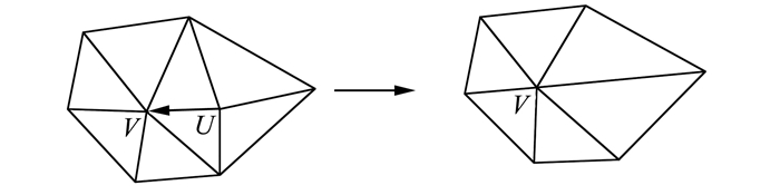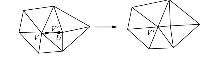 而半边折叠的思想则是在此基础上做了一些改进,同样是去掉了两个面,但是并没有产生新的点,只是去掉了一个点,如图 2所示,折叠边UV将U顶点移动到了V顶点,所有与U相关的信息都被V顶点代替,每次半折叠简化操作都会从原有格网中删除一个顶点和两个面,这样一直迭代进行半边折叠操作,直到生成符合标准的简化模型。