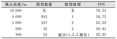 进行城市三维场景漫游时,对三维场景的渲染速度有一定的要求,不能出现卡顿,通常用每秒渲染帧数(FPS)来判断,通常渲染速度达到10 FPS以上,浏览器不会有很明显的卡顿。本文对不同视点高度、不同数量模型和不同精细程度的模型进行了统计,分别计算每秒渲染的帧数,统计结果如表 1所示。