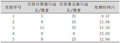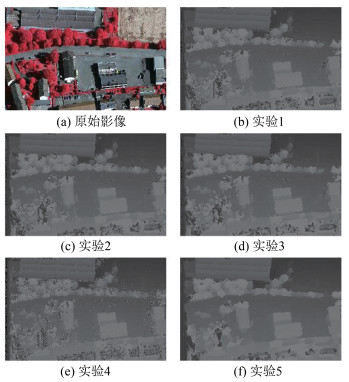 表 1展示了不同参数组合下FCG方法的处理时间。图 1展示了样例区域原始影像及利用FCG方法在不同实验方案下得到的结果。较大的计算或聚合窗口的抗噪能力强,结果光滑,但消耗时间多。由于FCG方法优化了代价聚合,聚合窗口对时间的影响要小于计算窗口对时间的影响。