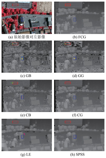 原始影像及不同方法获取的结果见图 2。其中,蓝色方框中楼房边缘深度不连续和遮挡区的局部放大图见图 3,红色方框中视差倾斜变化和纹理重复区的局部放大图见图 4。