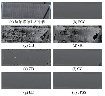 本文将FCG、基于梯度颜色差代价的盒状滤波匹配(matching with gradient and color difference cost and box fiter,GB)、基于梯度颜色差代价的引导滤波匹配(matching with gradient and color difference cost and guided fiter,GG)、Census测度盒状滤波的匹配(matching with Census cost and boxing filter,CB)、基于Census测度引导滤波的匹配(matching with Census cost and guided filter,CG)、Local Expansion(LE)[30]、倾斜平面光滑立体匹配(slanted plane smoothing stereo,SPSS)[31]方法进行对比。参数设置见表 2。