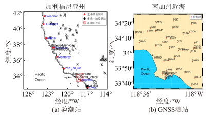 本文选取美国加州地区8个验潮站对海潮模型进行精度评估。同时,也选取南加州38个GNSS测站计算海潮负荷位移。验潮站和GNSS测站的位置如图 1所示。图 1(a)选取验潮站需要满足3个条件:①验潮站位于海潮模型计算范围内;②验潮站均匀分布在美国加州沿海地区;③验潮站近两年数据资料完整。基于此3个条件,从图 1(a)的15个验潮站中选取了8个验潮站。