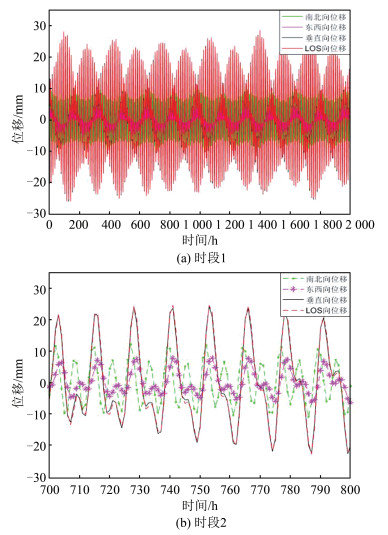 基于OF组合模型,选取位于美国南加州沿海区域内的近海点P1(33. 958°N,118. 428°W)和远海点P2(34. 341°N,117. 937°W),并计算LOS方向上P1-P2的相对位移。如图 2所示,其中图 2(a)时段为2015-01-01T1:00:00—2015-03-24T8:00:00(时段1),图 2(b)截取时段为图 2(a)中2015-01-30T5:00:00 —2015 - 02 - 03T9:00:00(时段2)。在图 2(a)中,LOS向位移的周期与海潮负荷位移趋于一致;在图 2(b)中,LOS向位移曲线与垂直向海潮负荷位移几乎重合,与东西(南北)向有差异。尤其在峰值时,LOS向位移达到25 mm,而东西(南北)向为10 mm。这说明LOS向位移主要受垂直向海潮负荷位移影响。