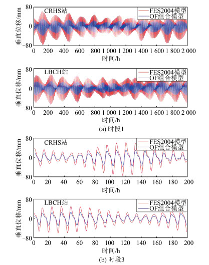 本文以沿海CRHS站与LBCH站为例,对比OF组合模型与全球海潮模型FES2004计算的垂直向海潮负荷位移。