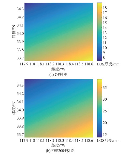 将不同海潮模型计算的海潮负荷位移转换至LOS方向,并将时间点为2015-01-01T20:00:00和2015-03-01T20:00:00的两幅图像进行差分,然后对不同海潮模型结果进行分析。如图 4所示,FES2004模型计算的LOS向位移值的趋势与OF模型一致,但数值高于OF模型,且FES2004模型计算值近乎是OF模型的两倍。其主要原因是全球模型计算南加州海潮负荷位移的精度要低于组合模型。同时,结合图 1可以发现在美国南加州中LOS向位移量越靠近内陆越小。这是因为从近海岸到内陆,海潮负荷影响逐渐减小。