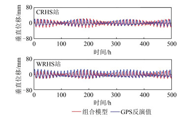 本文利用GPS PPP方法[10-11]获取海潮负荷位移,转换为LOS向位移,并将结果与OF组合模型对比。考虑到离太平洋海域近的测站影响更大,因此,从38个测站中选取离海更近的两个测站:CRHS站和WRHS站,并将其2 h时长的GPS PPP计算的海潮负荷位移与OF组合模型计算的垂直向海潮负荷位移对比,时段为2015-02-20T1:00:00-2015-03- 12T20:00:00约500 h。其结果证明:在CRHS站以及WRHS站中,GPS PPP反演值与OF组合模型计算的海潮负荷位移趋势一致。垂直位移对比如图 5所示。