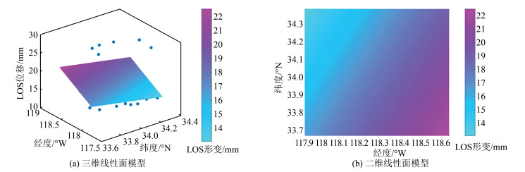 接着,将GPS PPP计算的海潮负荷位移转换为LOS向位移,并与OF组合模型计算结果对比,以此来评估海潮模型计算LOS向位移的有效性。海潮负荷效应具有近双线性分布的空间特征[12-13],可拟合成平面,因此可以将南加州沿海区域的38个GNSS站计算的LOS向位移模拟为线性面模型。利用OF组合模型计算2015 - 01 - 01T20:00:00-2015 - 03 - 01T20:00:00(时段3)的38个GNSS站的LOS向位移,然后将其差分并模拟为线性面模型,如图 6所示。