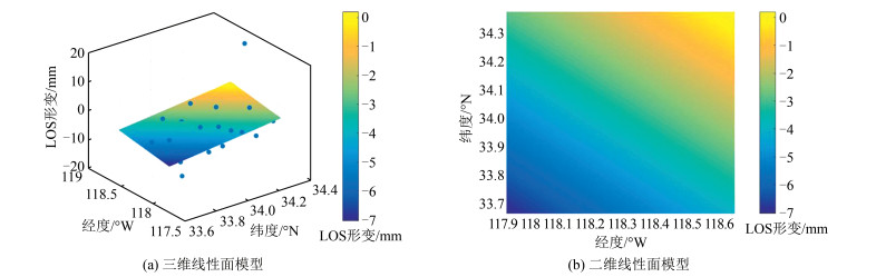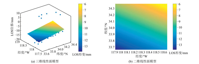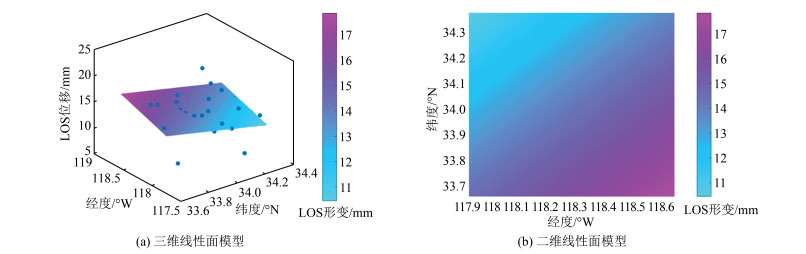 基于38个测站资料,将2015 - 01 - 01T20:00:00 -2015 - 03 - 01T20:00:00的GPS PPP结果转换为LOS向位移,然后在南加州研究区域里将其差分并模拟为线性面模型,如图 7所示。