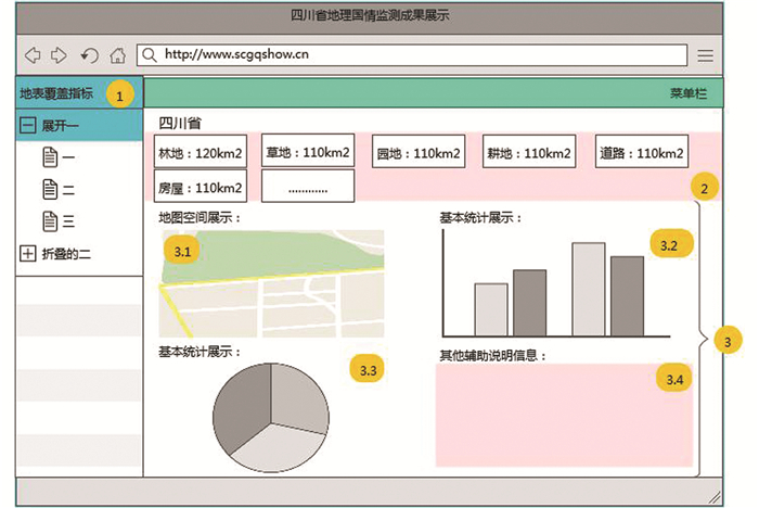1.2 可视化方法国情数据成果展示需要回答数量问题。根据信息的优先性进行系统展示,即将地图展示、基本统计成果展示分为多个区域,逐个展示不同的信息。界面设计如图 1所示。