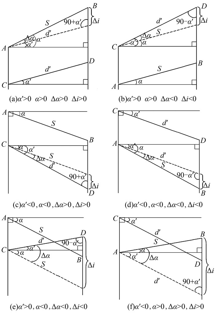当Δi<0时(实测边与应测边的关系见图 1(b)、1(d)、1(e)),Δα<0,可得: