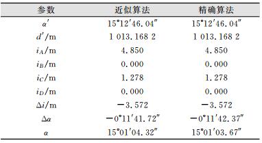 从式(3)和式(5)可知,近似算法误差的大小与d′、α′、Δi值的大小有关,而Δi与测控设备的类型有关,不同的测控设备其设备高不同,设备高iA一般在0.280~4.850 m之间,d′一般在100~3 000 m之间。表 1为分别采用近似算法和精确算法进行物理仰角改算的实例,结果相差0.65″。