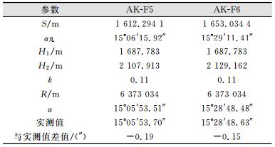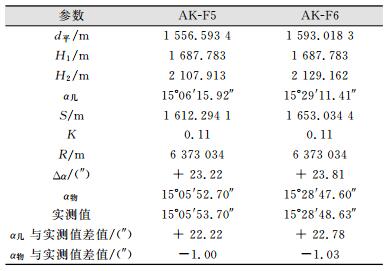 使用两组实测垂直角来验证换算关系式的精度,表 2首先使用式(6)计算几何仰角α几,然后根据式(8)和式(9)将几何仰角α几换算为物理仰角α物,并将结果与实测值进行比较。