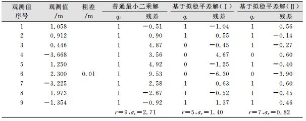 1) 令qi=1(i=1, 2, 3, …, 9),即所有观测值为拟准观测值,计算结果与经典最小二乘平差一致,结果见表 1。