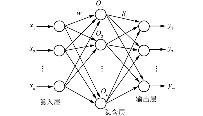 1 基本原理 1.1 极限学习机原理ELM是一种单隐层前馈网络(single-hidden layer feedforward neural networks,SLFNs)学习算法[11]。与传统神经网络不同,ELM算法将广义SLFNs的所有隐藏节点参数随机化,并通过分析确定SLFNs的权重。所有隐藏的节点参数都独立于目标函数或训练数据集。ELM由输入层、隐含层和输出层组成,其网络结构如图 1所示。