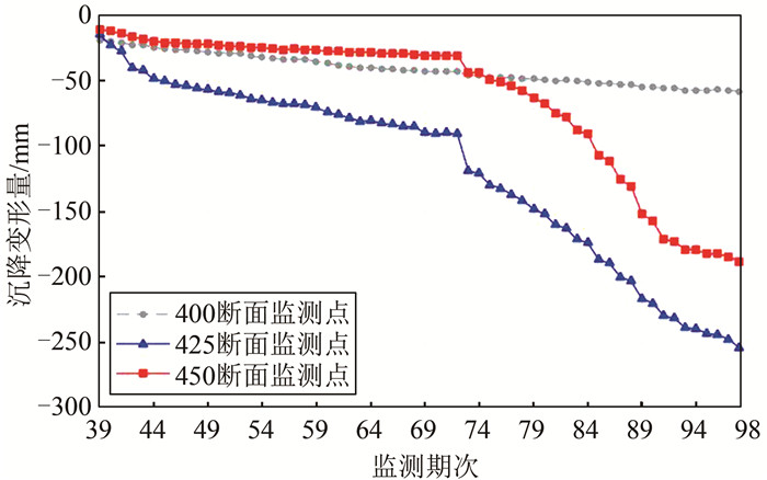 2 实例分析 2.1 工程概况某在建隧道为双线隧道,设计纵坡为12.20‰,其进口(JDK11+360)覆土厚1~2 m,基岩为泥岩,土层及风化层厚4 m左右。进口设置一环45 m长的Φ108大管棚加强支护,采用台阶+临时仰拱法控爆开挖;JDK11+390~JDK11+800段隧道洞身位于人工弃填土层中,工程地质条件差,开挖容易产生滑塌[15],采用交叉中隔壁法(CRD法)非爆开挖。为了确保隧道施工作业的正常进行,对隧道地表进行沉降变形监测,监测点沿隧道地面中线呈横断面(监测断面)布设,监测断面纵向间距25 m,每个监测断面布设7个监测点,其中JDK11+400、JDK11+425、JDK11+450监测断面中心监测点(400-1、425-1、450-1)的沉降变形数据如图 2所示,监测频率为1~2次/d,已获取98期监测数据。