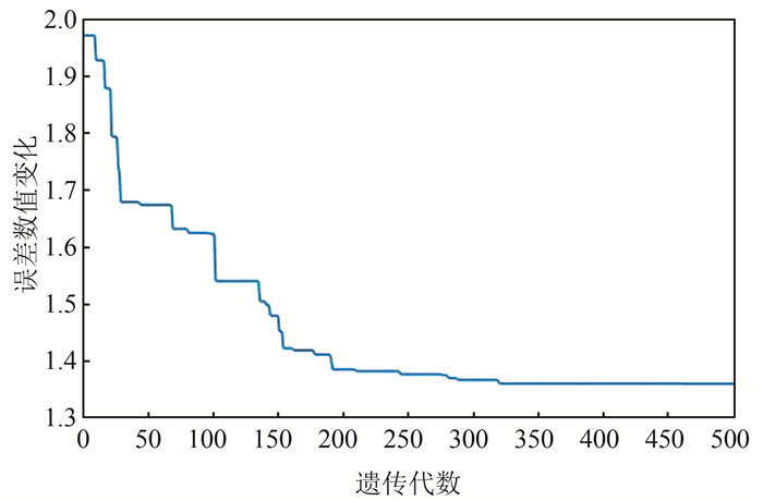 利用遗传算法优化ELM模型的初始权值和偏置,构建GA-ELM预测模型。设置GA种群数目为50,最大遗传代数为500,代沟为0.9,交叉概率为0.7,编译概率为0.005,以训练样本输出结果的均方误差作为适应度函数(目标函数)。代入样本数据,GA-ELM模型经过500次进化计算得到最佳适应度的稳定迭代值为1.36,如图 3所示。