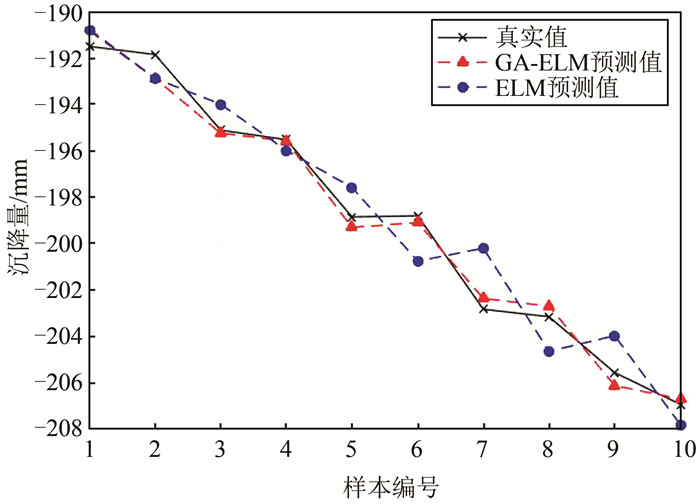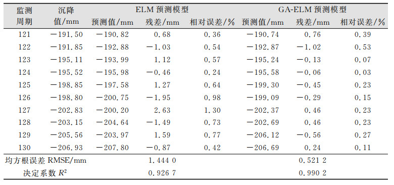 采用ELM模型对监测点450-1沉降进行预测的结果为:均方根误差(root mean square error, RMSE)值为1.444 0,决定系数R2值为0.926 7;采用GA-ELM模型进行沉降预测的结果为:RMSE值为0.521 2,R2值为0.990 2。评估指标中,RMSE值越小,表明模型偏差越小;R2值越接近1,表明模型吻合程度越高。对比结果可知,优化后的GA-ELM模型预测效果得到明显改善,比未优化的ELM模型具有更高的泛化能力和预测精度。