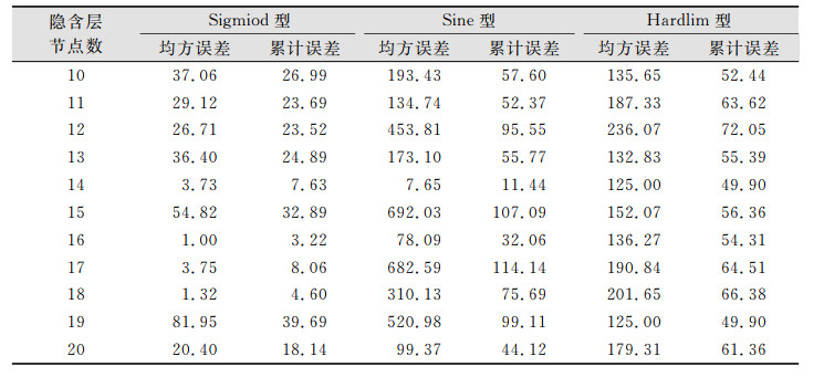 建立简单的ELM预测模型,输入层节点数为10,输出层节点数为1,随机给定输入权值和偏置,通过“试算法”对比不同激励函数(Sigmiod型、Sine型和Hardlim型)和隐含层节点数的预测效果,确定ELM模型的最优激励函数和隐含层节点数,预测结果如表 1所示。