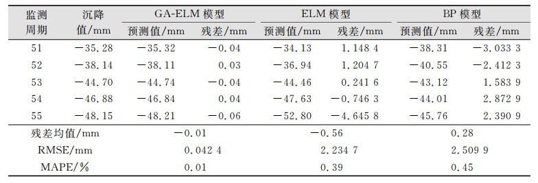 2.3 可靠性验证为进一步测试GA-ELM预测模型的可靠性,采用GA-ELM模型、ELM模型和传统BP神经网络进行预测精度对比,各模型的网络拓扑结构相同。实验数据选择下一监测断面JDK11+475的监测点475-1实测数据,采用滚动预测方法对第51~55期进行沉降预测,从残差均值、均方根误差RMSE以及平均绝对百分比误差(mean absolute percentage error, MAPE)3个方面评定模型的预测精度,结果见表 3。
